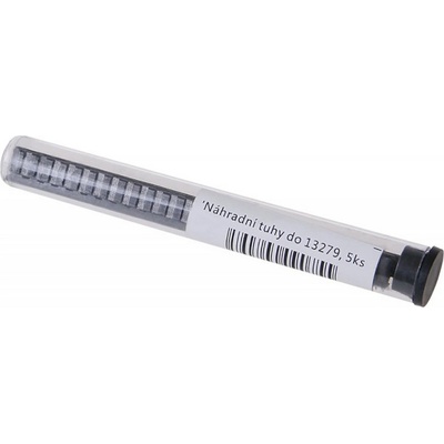 Náhradní tuha do tesařské tužky (5 ks). Tuha je dělena na segmenty o délce cca 5 mm, které se po otupení odlomí a je opět ostrý hrot. Klasická tvrdost tuhy - HB. Ochranný plastový tubus s 5 kusy náhradních tuh.