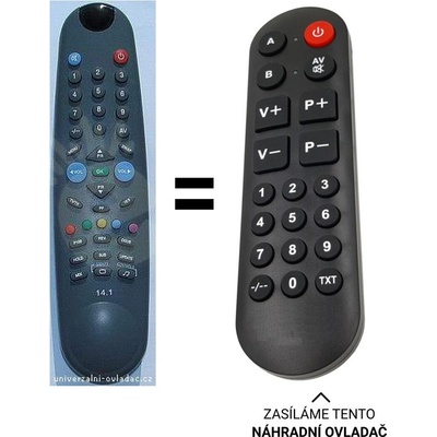 Náhradní ovladač pro televizory TESLA TELEVISION. Nepotřebuje kódy. Nahrazuje dálkové ovladače: RR103, PR105, RC023, RC26, 49900023. CHASSIS E5, E7, F19 Modely : TVS2830TS,...
