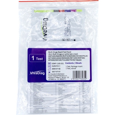 16v1 OXY/TRA/FEN/KET/COC/THC/MOP/MDMA/AMP/MET/BZO/TCA/BAR/MTD/BUP/LSD multitest od VivaDiag je navržen pro rychlou a přesnou detekci široké škály drog a zneužívaných léčiv v...