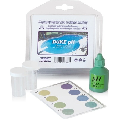 DUKE pH Kapkový tester bazénové vody a vody ve vířivých vanách, který slouží ke stanovení pH vody. Lze aplikovat až na 120 použití. Ideální hodnota pH je mezi 6,8 až 7,4, podle barevného terčíku, který je přibalen k testeru. Měření by se mělo doporučeně provádět 1x...