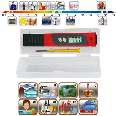 Specifikace: pH 0,00 - 14,00 / 0 - 60 ° C Je kyselé nebo zásadité? Čtěte okamžitě! Měření teploty kapaliny a vzduchu použití pro: bazény, vířivky, nádrž na ryby, vodu z vodovodu, minerální vodu, ovocný džus, ...... již žádné potíže s testovacími proužky, dobře...