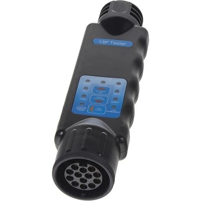 Tester slouží k otestování elektrických okruhů 13-pol zásuvky s napětím 12V automobilů a 13-pol vidlic přívěsných vozíků s napětím 12V. K provozu je nutné vložit 9V baterii...