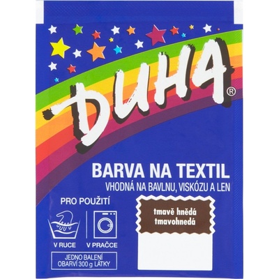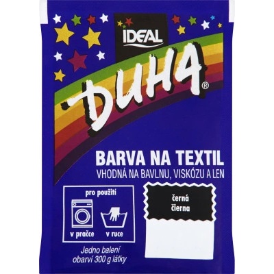 Duha barva na textil 15 g černá Barva vhodná na bavlnu, viskózu a len. Jedno balení obarví 300 g látky.POUŽITÍ:Ruční barvení:Obsah sáčku rozpusťte ve ¼ l vroucí vody....
