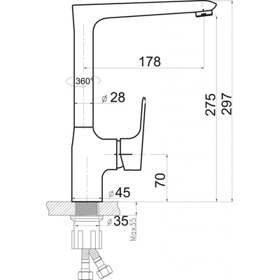 Dřezová baterie stojánková provedení chrom výška výrobku 297 mm délka výtoku 178 mm komfortní zóna 275 mm typ baterie stojánková odolná keramická kartuše 35 mm s otočným ramenem o 360° součástí baterie jsou přívodní hadičky