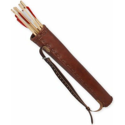 Zádový toulec sešitý koženými řemínky, opatřený popruhem pro nošení přes rameno. Toulec je zhotoven z cca 4 mm silné hovězí kůže, horní lem je opatřen provlékaným zdobením....