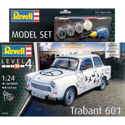 Plastikový model Revell 67713 – auto Trabant 601S v měřítku 1:24 ke slepení. Stavebnice obsahuje 138 dílků, lepidlo, štětec, barvičky, délka 149 mm, obtížnost 4.