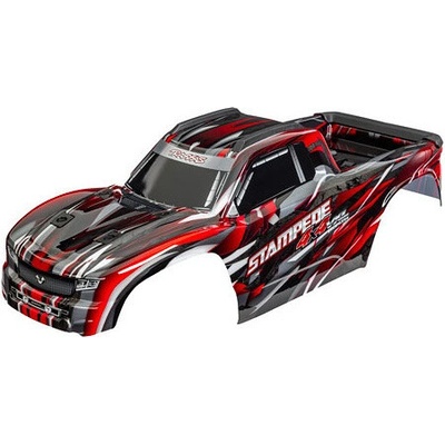 Náhradní díl pro RC modely aut Traxxas Stampede 4x4 1:10 VXL: karosérie červená. Nabarvená, aplikované obtisky, sestavená s předním a zadním držákem nástavby a zadní podpěrou...