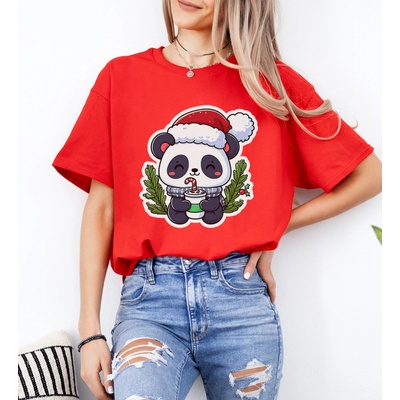 Vánoční Tričko panda pijící čokoládu unisex tričko červená