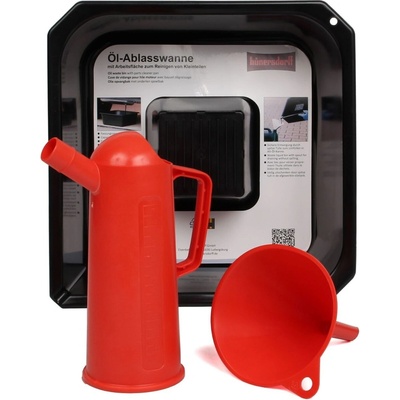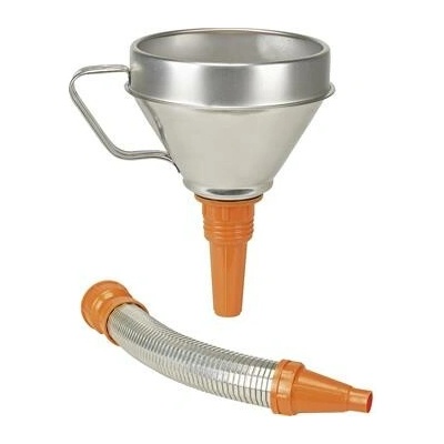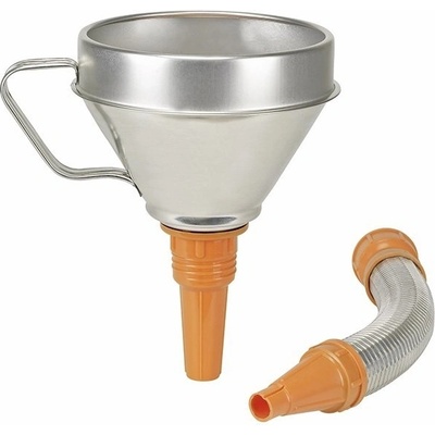 Kvalitní trychtýř z bílého plechu s vyšším límcem, s ergonomickým držadlem a s našroubovatelným kovovým pružným výtokovým nástavcem s plastovou koncovkou dobře odolává olejům,...
