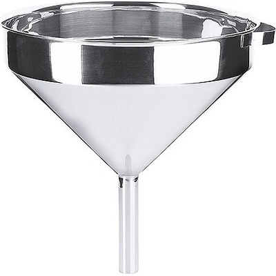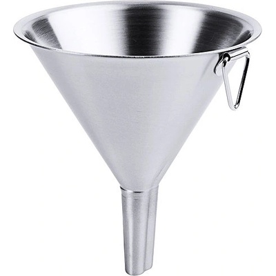 Trychtýř vyrobený z leštěné nerezové oceli s úchytem pro zavěšení. Vnější průměr dolní části 2,5 mm.