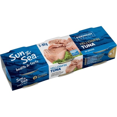 Sun & Sea Žlutoploutvý tuňák ve vlastní šťávě 3x80 g. Rybí konzerva. Sterilováno. Složení: Tuňák žlutoploutvý (Thunnus albacares) 70 %, pitná voda, jedlá sůl.