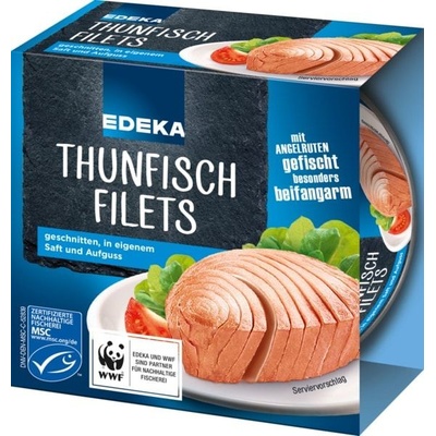 EDEKA tuňák ve vlastní šťávě 185g excelentní tuňák z pořádných kusů tuňáci z těchto konzerv byly loveni výhradně na lovecké pruty MSC přísně řízený rybolov z pořádných kusů...
