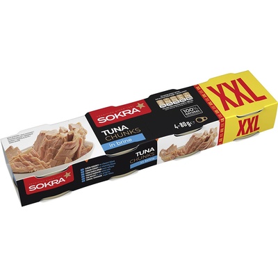 Sokra Tuňák kousky ve vlastní šťávě 4x80 g. Rybí konzerva. Sterilováno. Složení: Tuňák (Katsuwonus pelamis) 70 %, pitná voda 29 %, jedlá sůl.