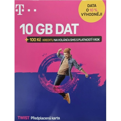 SIM karta T-Mobile Twist - předplacená - 10GB (5GB+5GB) - kredit 100 Kč Datová smršť: 10 GB pro ty, co chtějí víc! Hledáte SIM kartu, která vám umožní naplno si užít online svět bez omezení? Předplacená SIM karta s 10 GB dat (5 GB + 5 GB NAVÍC v aplikaci Můj T-Mobile)...