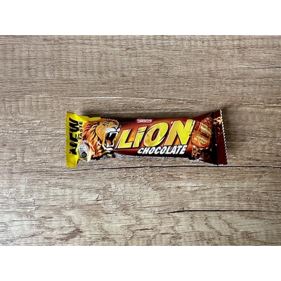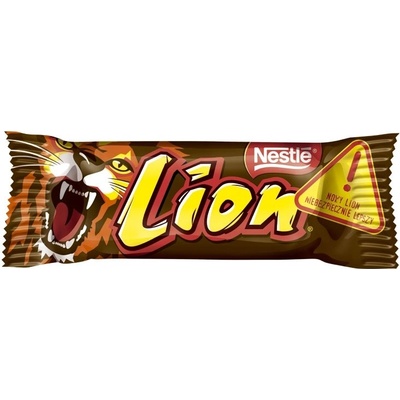 Oblíbená tyčinka Lion s příchutí brownies s karamelovou náplní a pšeničnými křupinkami, máčená v bílé čokoládě. Složení: cukr, glukózo-fruktózový sirup, rostlinné tuky...