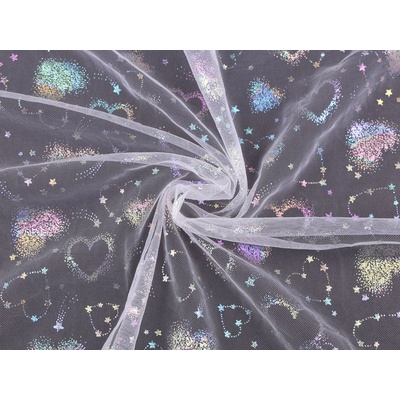 Jemný tyl zdobí potisk srdíček a drobných hvězdiček s AB efektem. Je měkký, elastický, ovšem po šíři pruží víc. Využijete ho na výrobu sukýnek, karnevalových kostýmů, závojů...