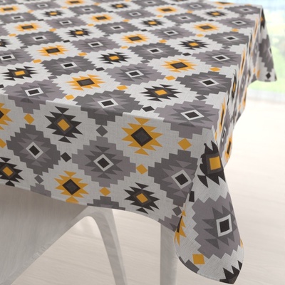 Bavlněný čtvercový dekorační ubrus na stůl se žluto-šedým aztéckým vzorem. Je ušitý z hustě tkaného 100% bavlněného plátna s certifikátem zdravotní nezávadnosti Oeko-Tex 100....