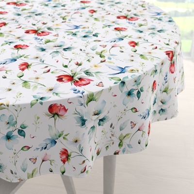 Teflonový kulatý ubrus na jídelní stůl se vzorem akvarelových květů s kolibříky na bílém podkladu, vyrobený ze 100% polyesterové látky s vodoodpudivou a nešpinivou teflonovou...