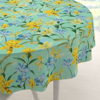 Teflonový kulatý ubrus na jídelní stůl se vzorem žluto-modrých lilií na mintovém podkladu, vyrobený ze 100% polyesterové látky s vodoodpudivou a nešpinivou teflonovou úpravou....