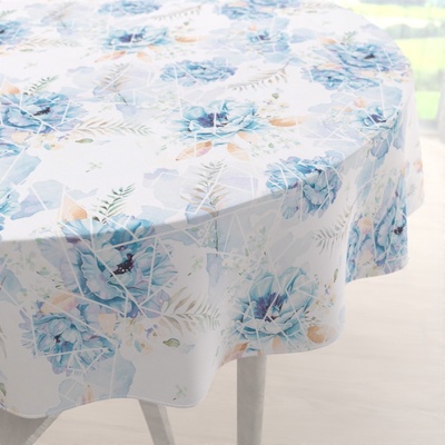 Teflonový kulatý ubrus na jídelní stůl se vzorem modrých květů na geometrickém bílém podkladu, vyrobený ze 100% polyesterové látky s vodoodpudivou a nešpinivou teflonovou...