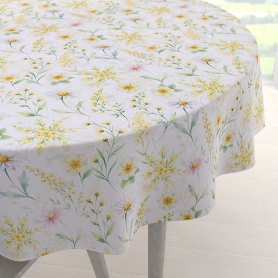 Teflonový kulatý ubrus na jídelní stůl se vzorem malovaných žluto-zelených lučních květin na bílém podkladu, vyrobený ze 100% polyesterové látky s vodoodpudivou a nešpinivou...