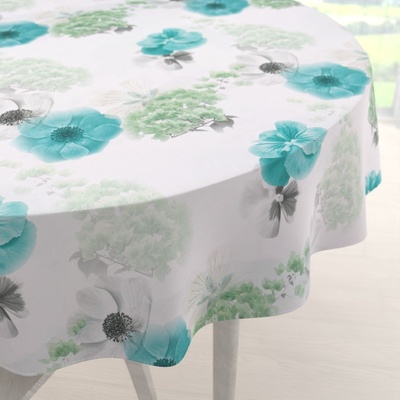 Teflonový kulatý ubrus na jídelní stůl se vzorem tyrkysových růží na bílém podkladu, vyrobený ze 100% polyesterové látky s vodoodpudivou a nešpinivou teflonovou úpravou. Je...