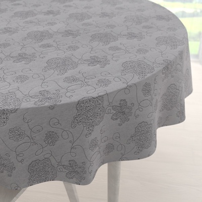 Teflonový kulatý ubrus na jídelní stůl s vytkaným vzorem květovaných ornamentů na šedém podkladu, vyrobený ze 100% polyesterové látky s vodoodpudivou a nešpinivou teflonovou...