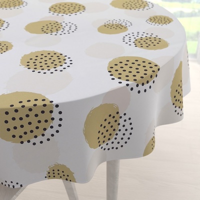 Teflonový kulatý ubrus na jídelní stůl se vzorem okrových a světle meruňkových puntíkových kol na bílém podkladu, vyrobený ze 100% polyesterové látky s vodoodpudivou a...