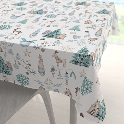 Bavlněný čtvercový dekorační ubrus na stůl se vzorem vánočních ozdob v šalvějově zelených, světle modrých a hnědých barvách na bílém podkladu. Je ušitý z hustě tkaného 100%...