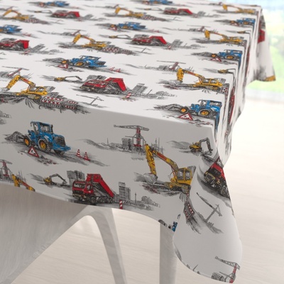 Dětský bavlněný čtvercový dekorační ubrus na stůl s milým dětským motivem náklaďáků, bagrů a buldozerů v červených, žlutých a modrých barvách na bílém podkladu. Je ušitý z hustě...