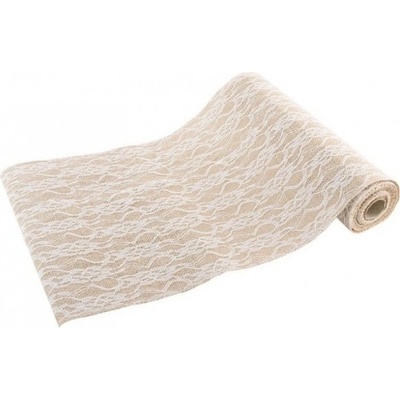 Šerpa stolová jutová s bílou krajkou Krásná romantická jutová šerpa s povrchovou ozdobu v podobě bílé krajky. Textilní šerpa se hodí na všechny slavnostní tabule v přírodním...