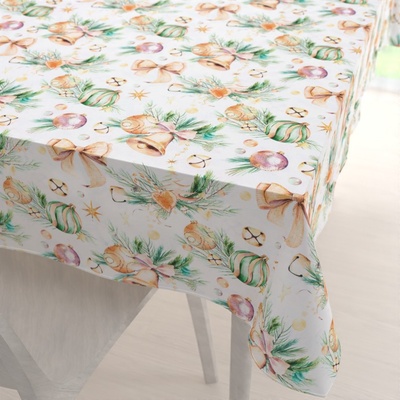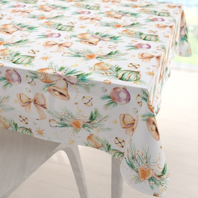 Dekorační obdélníkový ubrus na jídelní stůl s vánočním vzorem baněk a zvonečků na bílém podkladu. Je ušitý z kvalitní a pevné dekorační látky s digitálním tiskem, se složením z...