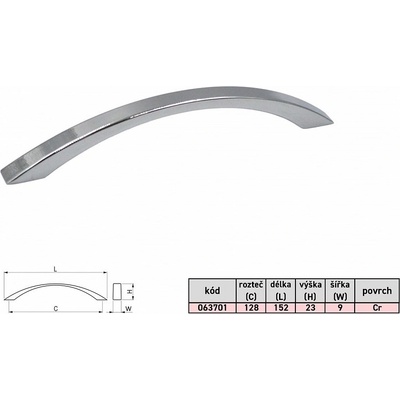 celokovová jednodílná úchytka ze slitiny zinku rozměry: r.128 d.155 š.10 v.26 mm provedení - chrom lesk balená včetně šroubků M4 pro uchycení Obrázky u...
