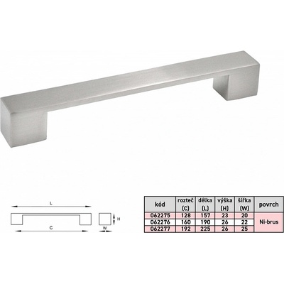 Úchytka NIKOL celokovová jednodílná úchytka ze slitiny zinku rozměry: r.128 d.158 (celková délka) š.20 v.22 mm provedení (povrch) - broušený nikl materiál -...