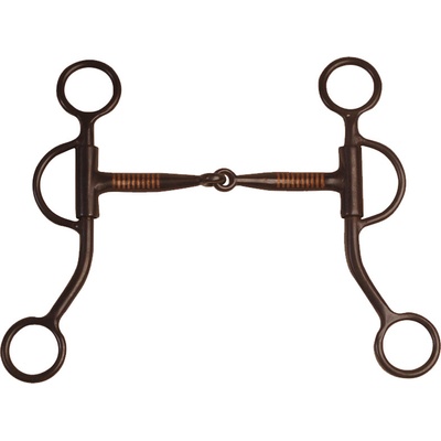 Kloubové westernové udidlo z černého železa s krátkými a zahnutými rameny. Vybaveno měděnými vložkami, které podporují slinění. jednou lomená páka černé železo měděné vložky