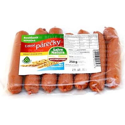 Párečky uzené vegi 250g SalveNatura Uzené párečky jsou varianta párků pro labužníky, mají lehce pikantní, kořeněnou a uzenou chuť.Složení voda, pšeničná bílkovina, kukuřičný...
