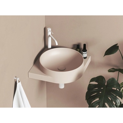 Tenkostěnné keramické rohové umyvadlo Yard k instalaci na konzoli Yard, bez přepadu. V provedení Alabaster Pink. S otvorem pro stojánkovou baterii.