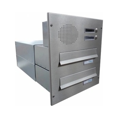 Sestava poštovních schránek včetně elektro krabice, uchycená do odnímatelné čelní nerez desky, určená k zazdění do sloupku. V čelní desce integrovány vhozové sklapky, plastové...