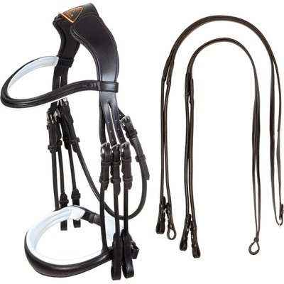 Vysoce kvalitní uzda z velmi měkké pravé italské hovězí kůže s širokým švédským nánosníkem a bílou podšívkou. Má široký ergonomický a anatomicky tvarovaný nátylník. Lícnice se...