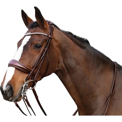 Moderní, vysoce kvalitní, kožená dvojitá uzda s lesklým, měkce polstrovaným švédským nánosníkem s válečkovými přezkami z nerezové oceli. Čelenka je zakřivená, zdobená třpytivými...