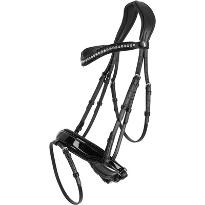 Elegantní uzdečka s anglickým kombinovaným nánosníkem. Má zakřivenou čelenku a nánosník zdobené kamínky a anatomicky tvarovaný nátylník. Čelenka a nánosník mají extra měkké...