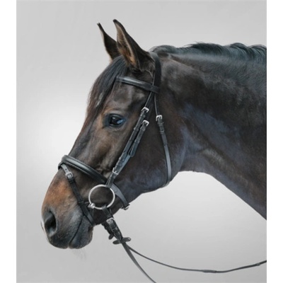 Kožená uzdečka s anglickým kombinovaným nánosníkem. Lehce vypolstrovaná čelenka a nánosník. Lineární podhrdelník a čelenka, poniklované železné spojení. Šířka otěží pro MSH a SH...