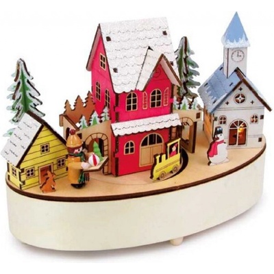 Při melodii „Tichá noc“ jezdí vláček poklidným městečkem, kolem domků osvětlených malými žlutými světélky. Díky velkému množství drobných detailů přitahuje dekorace pozornost....