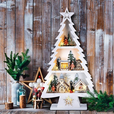 Menší varianta oblíbeného dřevěného stromku je vysoká 53 cm a šířka 30 cm. Je vybavena 13 LED diodami, které září teple bílým světlem a osvěcují drobné barevné dekorace...