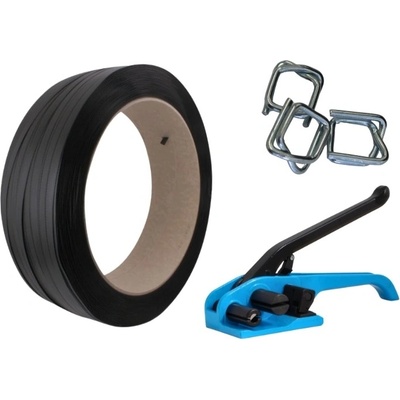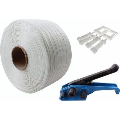 Sada vázací pásky a příslušenství vázací páska PES šíře 13 mm, dutinka 76 mm, návin 1100 m plastové spony na vázací pásky 13-16 mm, balení 1000 ks napínač PP a PES vázacích...