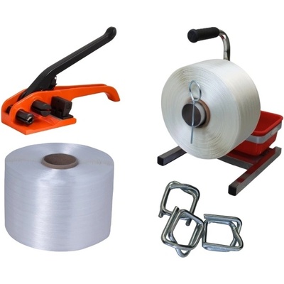 Sada vázací pásky PES a příslušenství. vázací páska PES WG 50 šíře 13 mm, dutinka 76 mm, návin 1100 m drátové spony na vázací pásky, šíře 13 mm, balení 1000 ks napínač PP a...