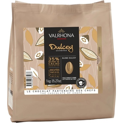 Valrhona Feves Bílá Čokoláda Dulcey 35% 250g Velmi delikátní bílá čokoláda s obsahem kakaa 35%. - Dulcey má decentně slaný nádech s karamelizovanými mléčnými tóny. -...