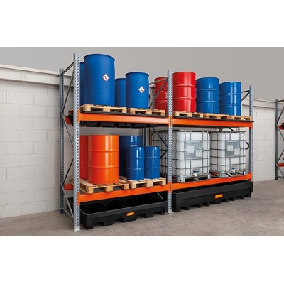 Základní paletový regál s PE záchytnou vanou o objemu 1100 litrů. Regál obsahuje 2 ukládací úrovně s nosností 3070 kg/úroveň. Pod spodní úrovní je umístěna záchytná vana z...