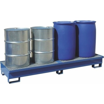 Ocelová lakovaná záchytná vana s žárově zinkovaným roštěm. Záchytná vana pro skladování 4x 200 l sudů v řadě. Provedení s roštem usnadňuje manipulaci se sudy. Vybaveno kapsami...