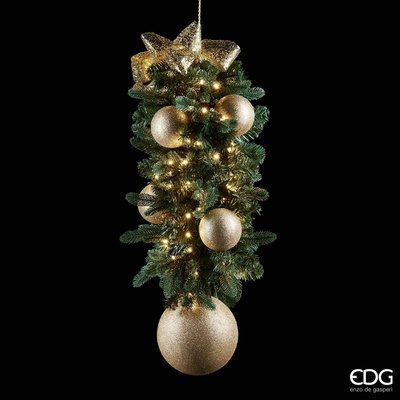 Velmi působivá luxusní vánoční závěsná dekorace se zlatými kulatými ozdobami, zlatou mašlí a umělým jehličím. Nepřehlédnutelná výška 50 cm ji předurčuje pro solitérní interiérovou dekoraci. Bude se vyjímat ve vstupní hale. - Výška: 50 cm - Materiál: PVC/sklo